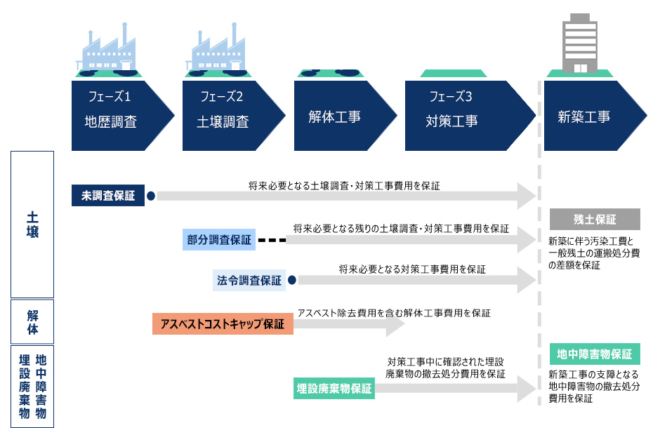 対策工事や新築工事の際に確認される地下構造物や埋設廃棄物の撤去・処分費用を保証