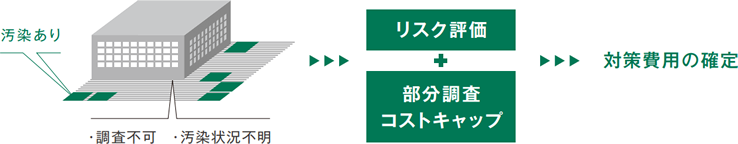 現況有姿の土地売買では、施設などが稼働中のために、やむを得ず土壌調査の範囲が限定的になるケースがあります。当社では、例えば屋外部のみの部分的な調査や、表層調査(平面の調査)までの途中段階の調査であっても、その結果から敷地全体の汚染状況を推定したうえでコストキャップ保証をご提供します。