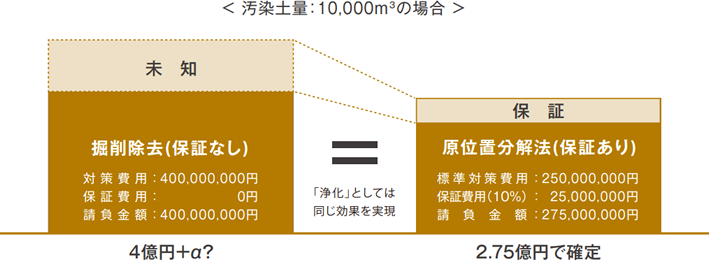 掘削除去と比較して微生物分解のような原位置浄化は コストメリットがありますが、計画通りに工事が進まず、追加施工の費用が必要となることもあり、採用が敬遠される場合があります。当社では、このような対策方法にコストキャップ保証を組み合わせることで、対策方法から不確実性を排除し、コストメリットがある確実な対策をご提案します。