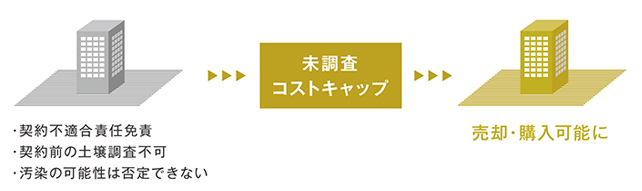 過去に業容不明の事業所が存在した土地であっても、さまざまな背景から地歴調査のみで売主の契約不適合責任免責での入札という条件が付されることもしばしば見受けられます。当社では、地歴調査で「土壌汚染の可能性が否定できない」と評価され、かつ土壌調査が実施できない土地に対して、過去の調査・対策実績等のデータに基づきコストキャップ保証を提供しています。